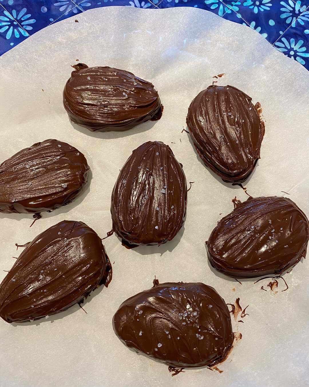 If chocolate pools underneath the eggs, lifting each one briefly with a fork and letting excess drip away before setting keeps the coating neat.